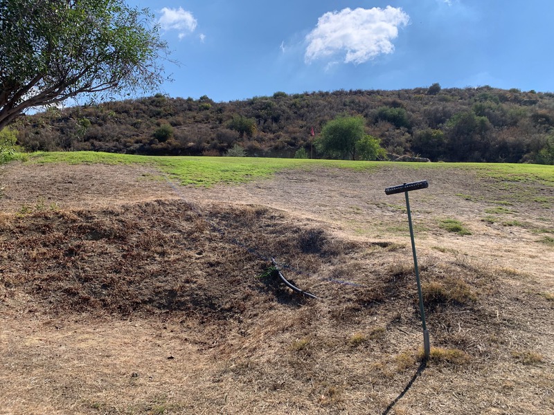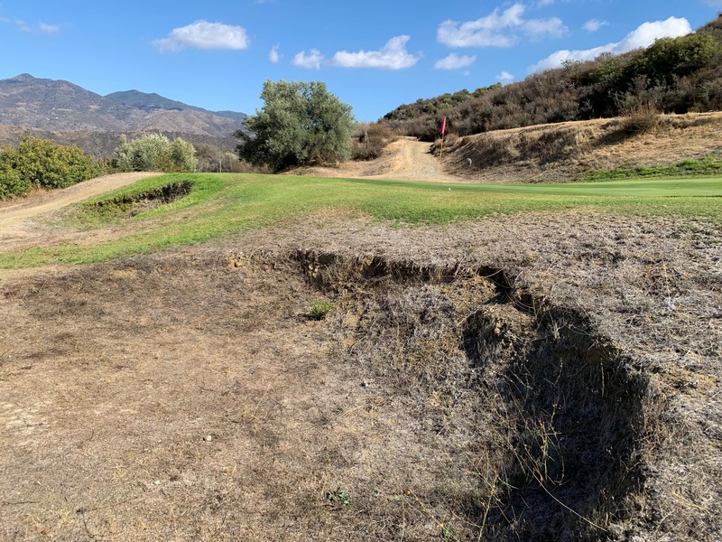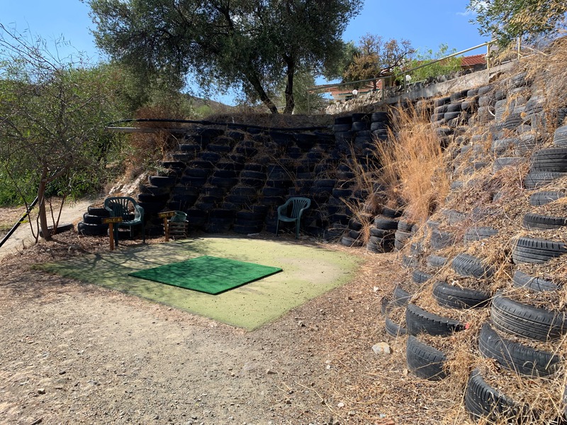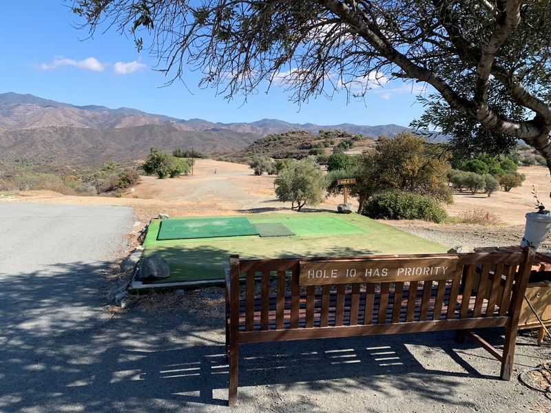 Abschlagboxen von betonierten Betonsockeln, die mit grünem abgenutzten „Teppich“ ausgelegt sind. Fairways ohne Gras (dies haben wir aber gewusst, siehe Homepage des Platzes), aber Gras wächst hier wahrscheinlich nur sehr spärlich, da das Fairway eher aus Geröll besteht. Ja man bekommt Abschlagmatten mit, oder man teet den Ball am Faiway auf, wenn das Tee im Stein/Geröll befestigt werden kann.