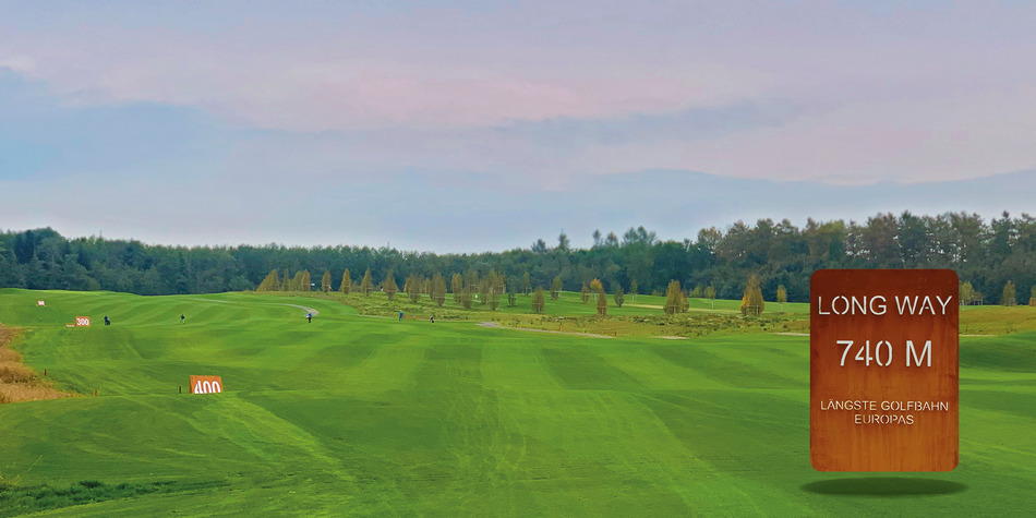 We decided to visit the course quite spontaneously; just drive there and play, it'll work out, was our motto. At 11:30 on a Monday it can't be that busy - despite the nice weather. And so it worked out. At the very friendly counter, we were informed of several available tee times, and we took the first one straight away... paid the green fee, borrowed a trolley (for €10 they even had an electric trolley from Kiffe), and then waited on the first tee for our flight partners (who seemed a bit surprised at first). Well, we booked it at the last minute, so you can't exactly count on them. A very nice couple, they were club members, took us along for the round, and it turned out to be a very enjoyable round with "local knowledge." The fairways are very varied, and you play some really interesting holes in the somewhat hilly landscape. The whole course is still quite new, so some of the vegetation is still quite young. Several works of art adorn the fairways, and on at least three holes, the bunkers are very interestingly designed (hands, heart shapes, rays) and named ( "The Left and Right Hands of the Devil," etc.). Hole 17, for those who wish to play it, offers a par 6—reputedly the longest hole in Europe at 740 meters. Alternatively, you can bypass the back tees and play a relatively standard par 5.