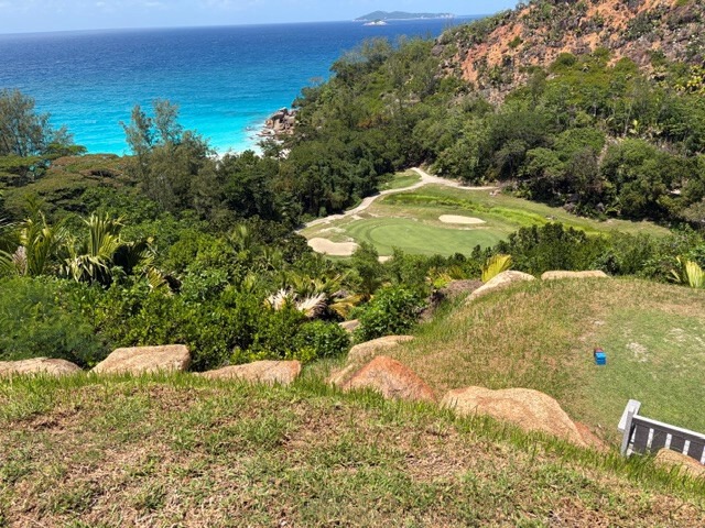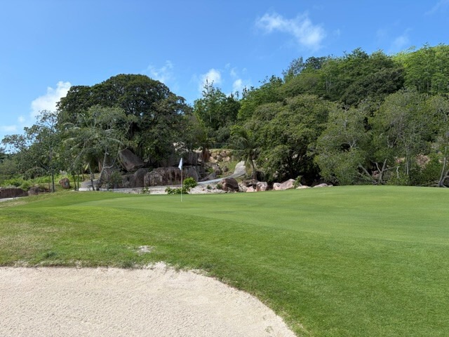 The 15th hole is fantastic, a par 3,152 meters long, but a pitching wedge is sufficient, it's so steep downhill! And the view of the sea with Anse Georgette is breathtaking. The 18th hole is also very beautiful, a par 5, again steep downhill, especially if you've already made it through the hill climb.