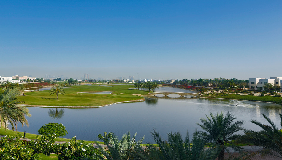 The Montgomerie, Dubai’s championship golf course was designed by Colin Montgomerie in association with Desmond Muirhead. The course covers 265 acres which consist of 123 acres of turf, 49 acres of man-made lakes (a total of 14 lakes), 93 acres of landscaped gardens and is scattered with 81 large bunkers.
