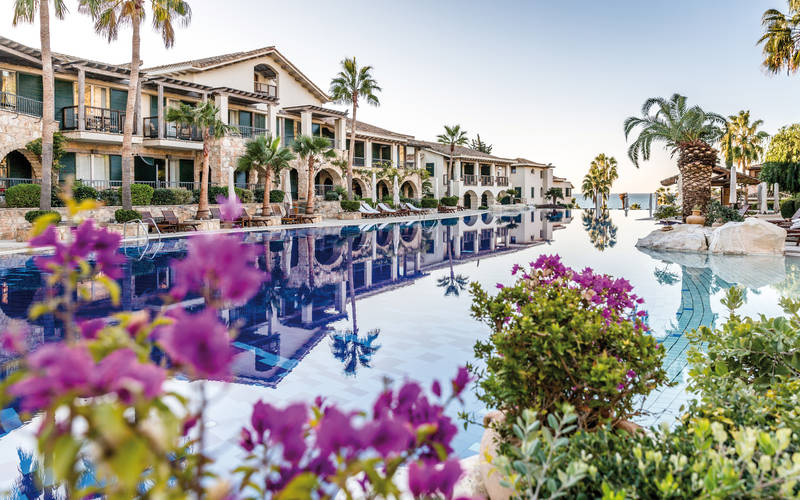 The COLUMBIA Beach Resort has an almost idyllic charm with its low-rise buildings and distinctive architecture resembling a typical Cypriot village. Located in the sheltered bay of Pissouri on the Southern coast of Cyprus, this five-star hotel features elegant suites, luxuriously furnished with fabrics and materials that reflect the colours of the landscape, the cliffs and the Mediterranean Sea. Using local stone, wooden features and creative planting, the Beach Resort stands in harmony with its surroundings, a clever mix of old and new. Lovingly restored terracotta roof tiles, graceful arches and shutters on the windows reflect the influences of traditional Cypriot architecture. The position of the Resort on a spectacular two kilometre beach and the dense vegetation in the valleys behind the bay is especially magical. Native flora, the flowers and plants that grow in this part of the island, the white cliffs of Cape Aspro to the east of the bay and the vineyards and orchards create a very secluded setting for the hotel.