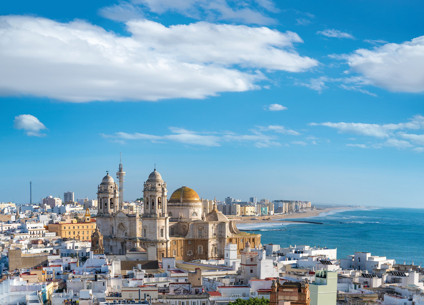On the horizon rise the white facades of Cadiz, while the golden domes of the cathedral reflect the radiant blue of the sky. Cadiz, looking back on over 3,000 years of history, was once a vibrant trading center. Today, the city preserves its pride in its magnificent palaces, the Miradores, which offer a breathtaking view of the endless sea.